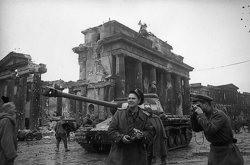 35. Photographer Yevgeny Khaldei in Berlin with Soviet troops at the Brandenburg Gate in May 1945