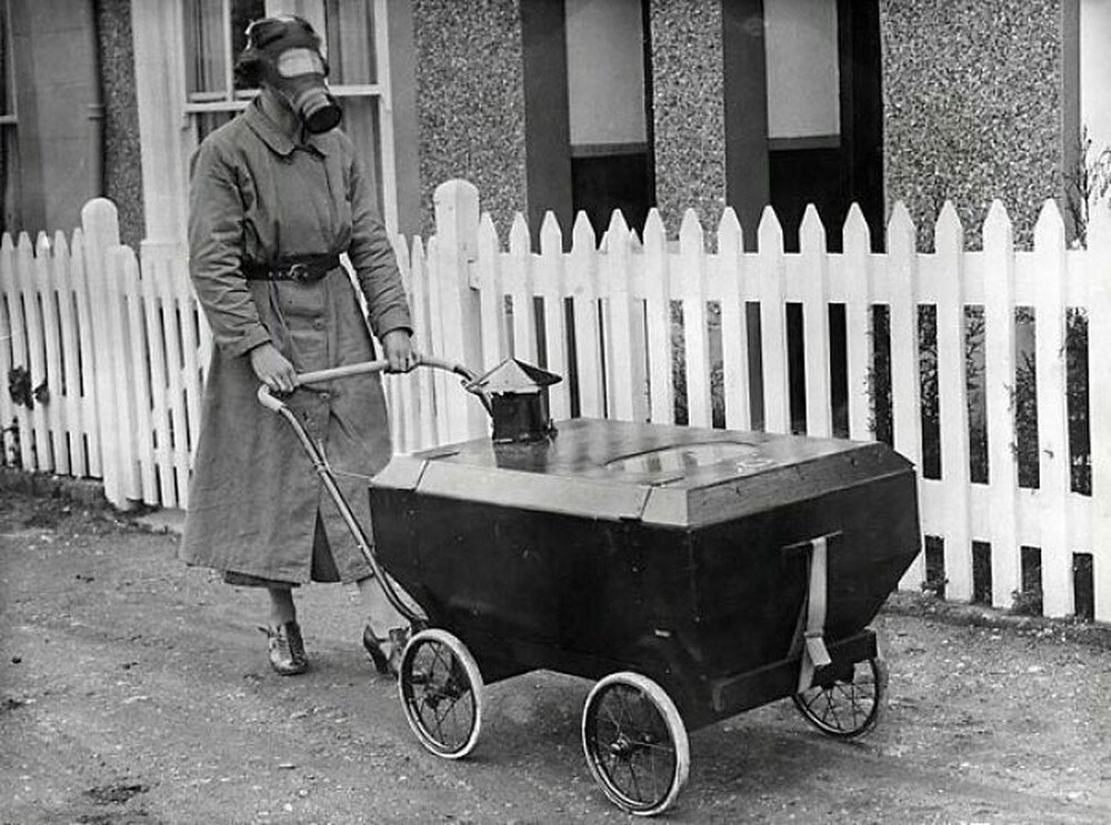 20. A woman in a gas mask walks with a gas mask stroller in England, 1938