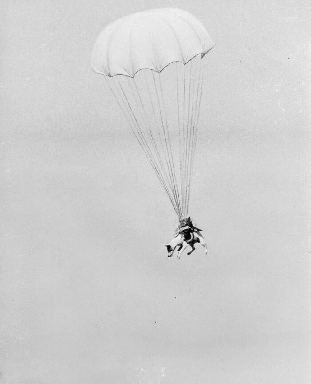 19. "Paradog" Salvo trains to jump with a parachute. Dogs accompanied the troops during the landings in Normandy, sniffing for mines, traps and enemy troops