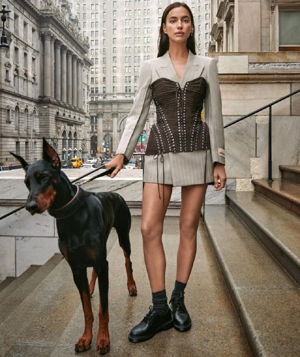 Irina took part in a photo shoot with a dog in New York. The main location for filming was the urban landscape of New York. Photographed by Cass Bird. In the frame next to the model stands doberman with cropped ears on a short leash.