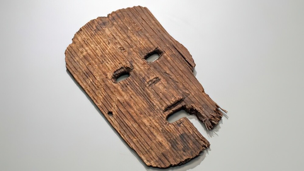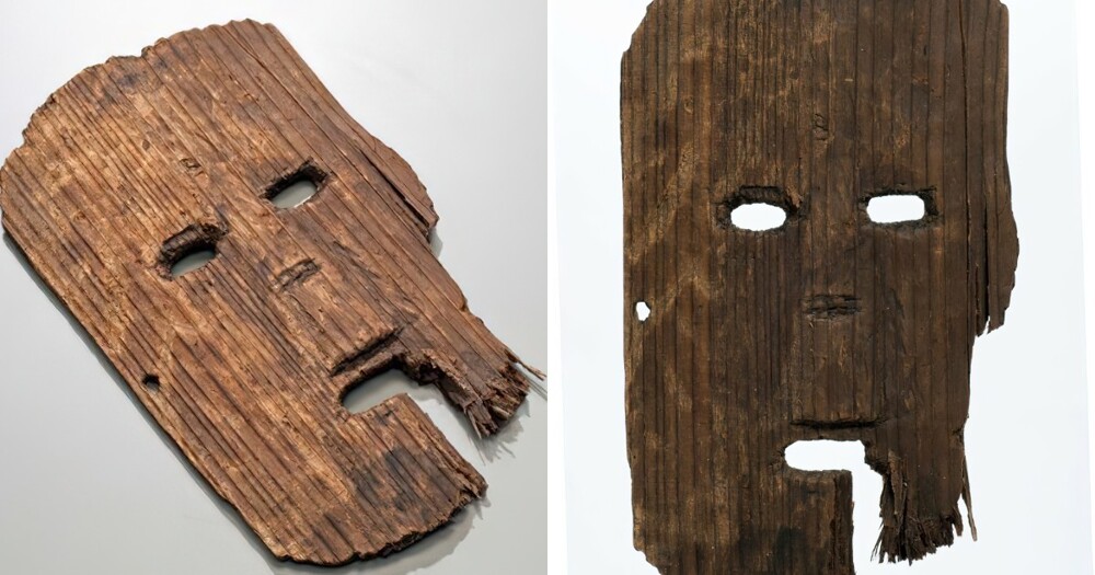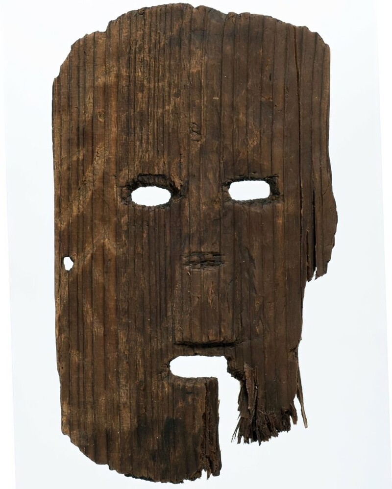 So far, only two wooden masks of this period. The mask is carved from cedar, measures about 30 cm high and 18 cm wide, it has holes for the eyes and mouth, as well as small holes on the sides - apparently for ties.