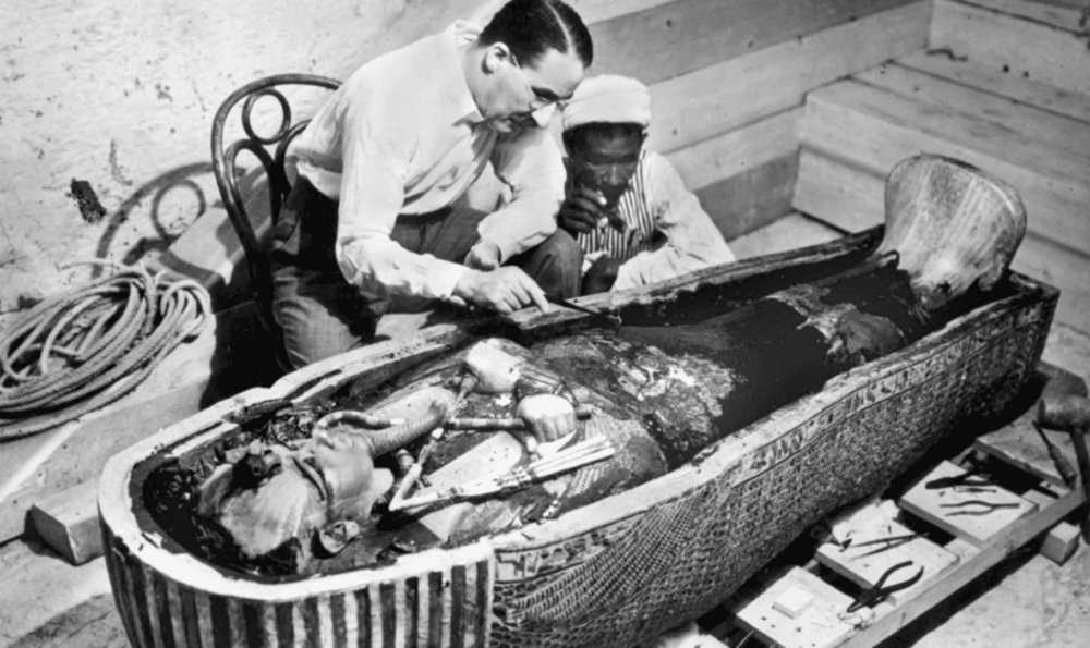Howard Carter and an assistant examining Tutankhamen's sarcophagus, 1922