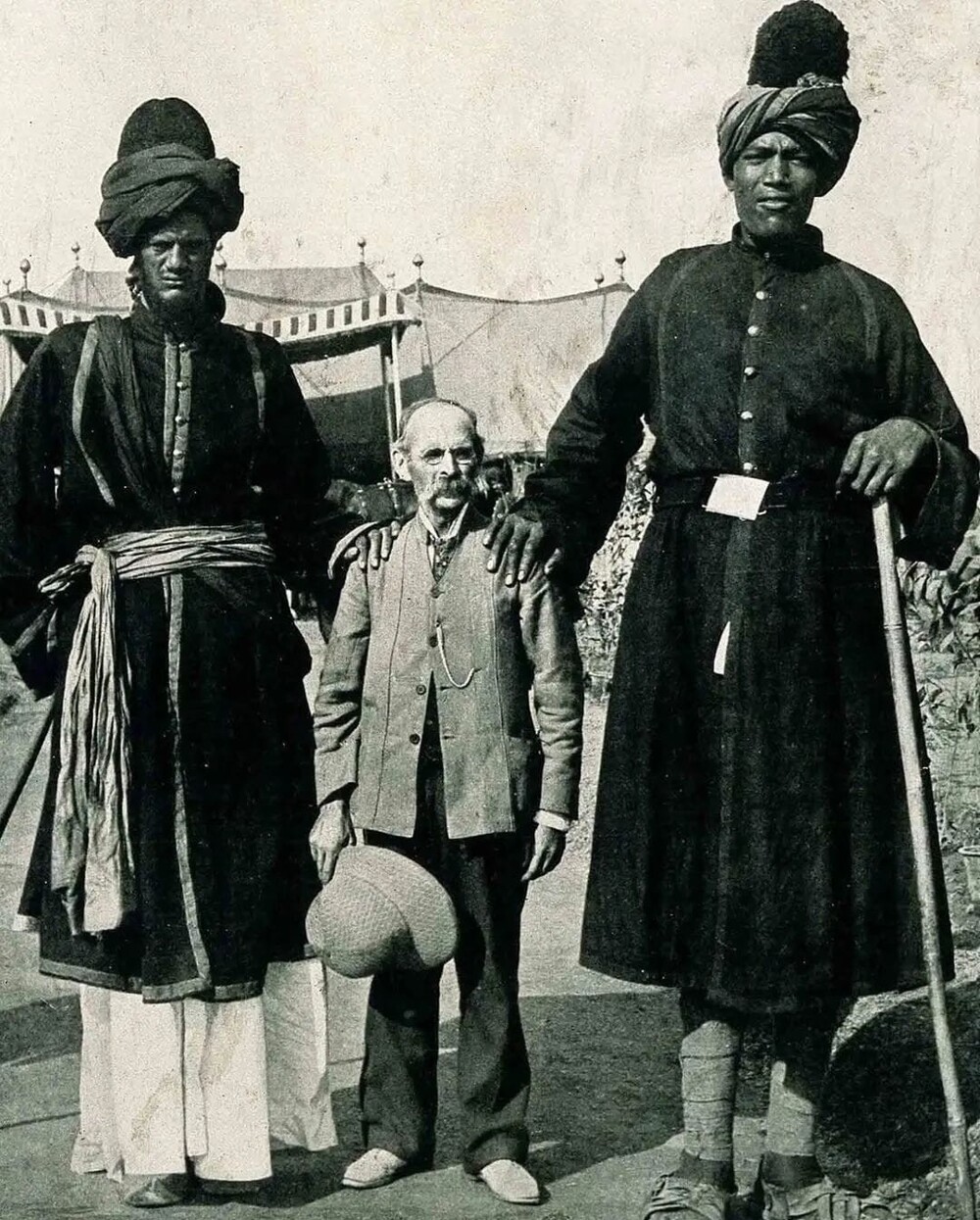 American photographer James Rickalton poses with two elite riflemen in the service of the Maharaja of Kashmir, 1903