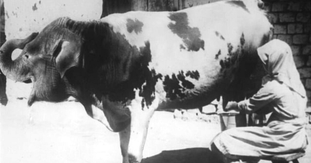 A woman milks a cow with an elephant's head. April Fool's joke in Het Leven magazine, Netherlands, 1932