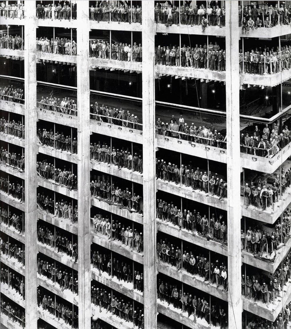 Over 3,000 workers building the Chase Manhattan Bank in New York City pose for a photograph at the end of construction work, 1964