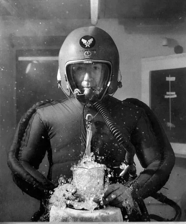A man in a space suit holds a beaker of boiling water. It is in a vacuum chamber that simulates a height of 20 kilometers, 8 February 1953