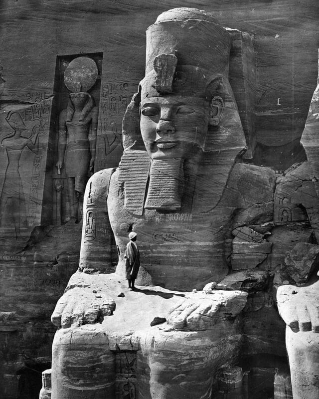 Photograph of a man kneeling at a statue of Ramesses in Egypt, 1856