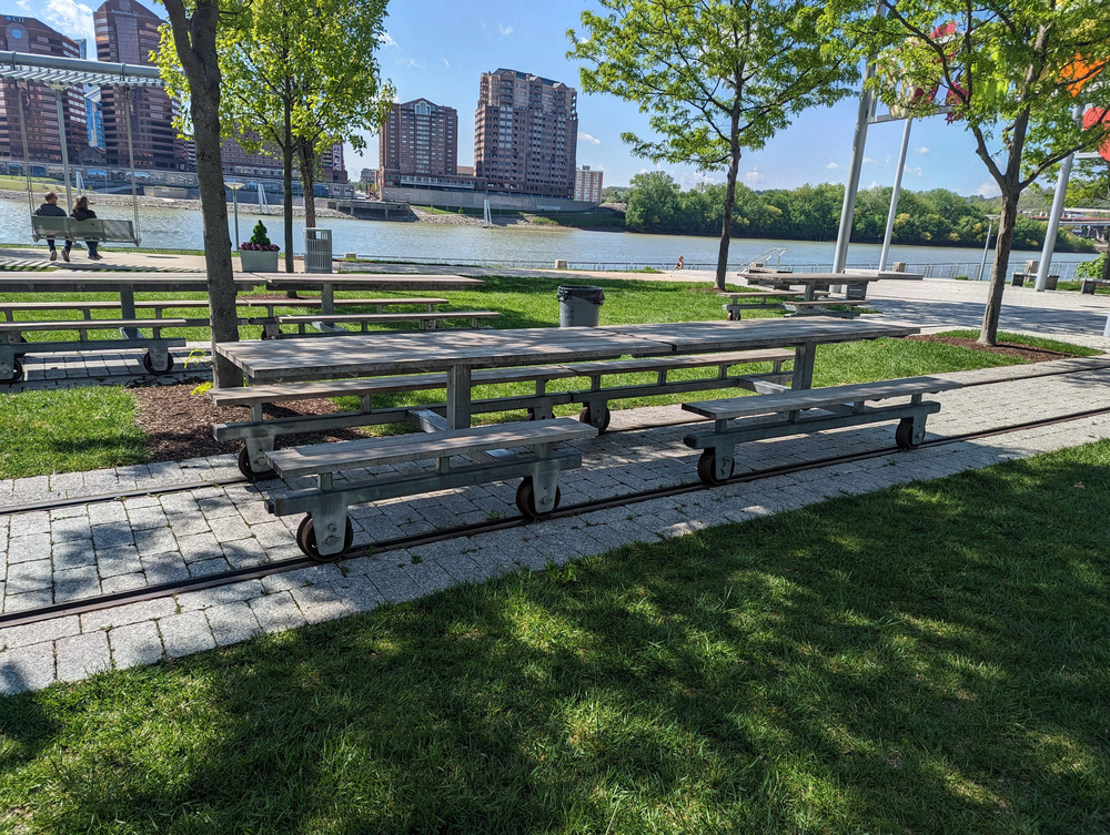 10. These picnic benches are installed on old tram tracks so they can be easily moved or pulled apart.