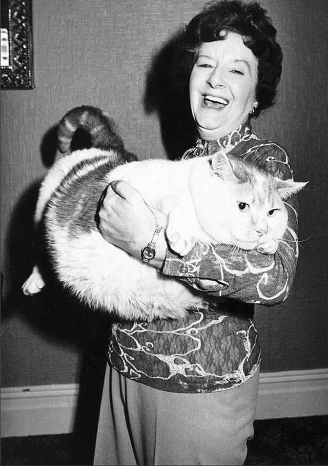 Hilda John and her six-year-old cat Thomas O'Malley, whose weight was 19 kilograms. England, 1977