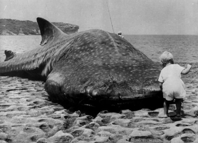 A small child and a giant whale shark washed up off the coast of Australia, 1965.
