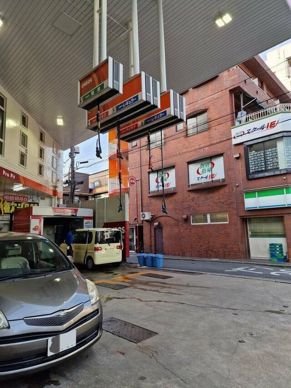 23. Gas station in Tokyo, where speakers hang from the ceiling