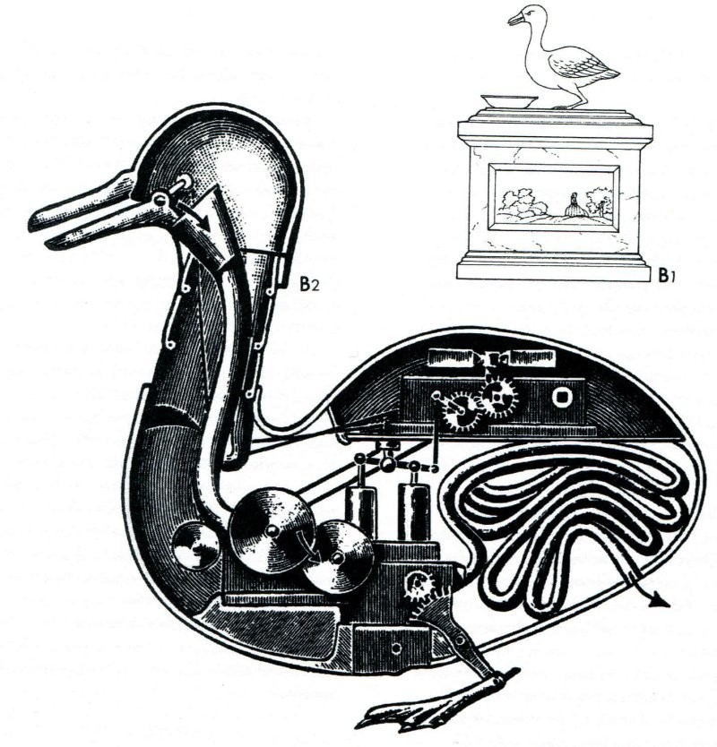 In 1738, an exhibition was held in Paris, at which presents an amazing creation of the master - a mechanical duck. The bird, mounted on a pedestal, quacked, drank water, pecked grain, raised and lowered its wings. But the miracle was the fact that food and water was digested by an incredible creature: waste came out of the duck life is already in a different color. It is clear that this process digestion did not occur. Just the products were stored in one compartment, and the "excrement" was fed from another. But the mechanic did not lose hopes to create a device with a real digestive tract.