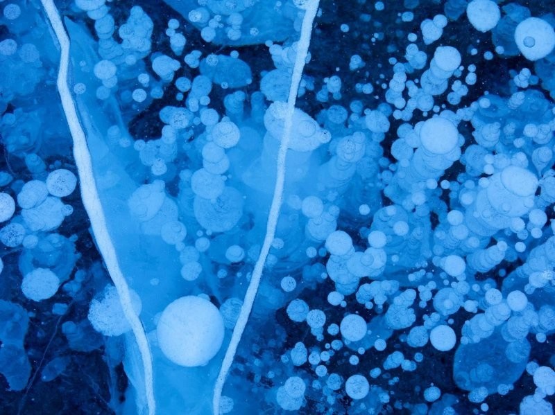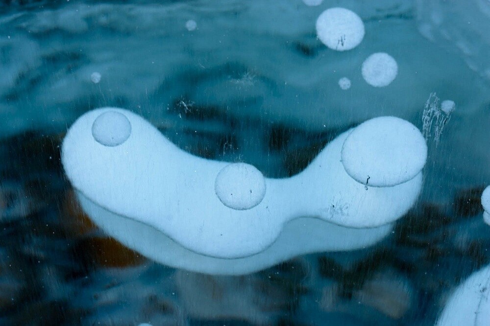 Although initially it looks mystical, no magic there is no. Patterns form methane bubbles that rise from the bottom towards the already formed ice crust. They freeze on different depths, forming an unusual picture.