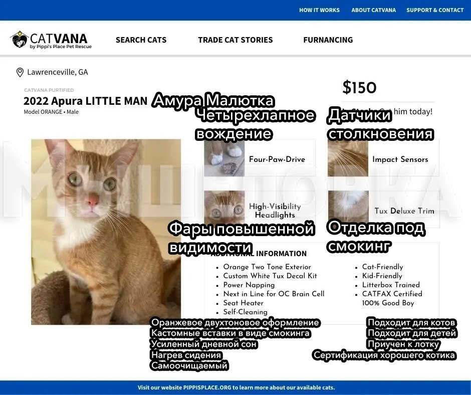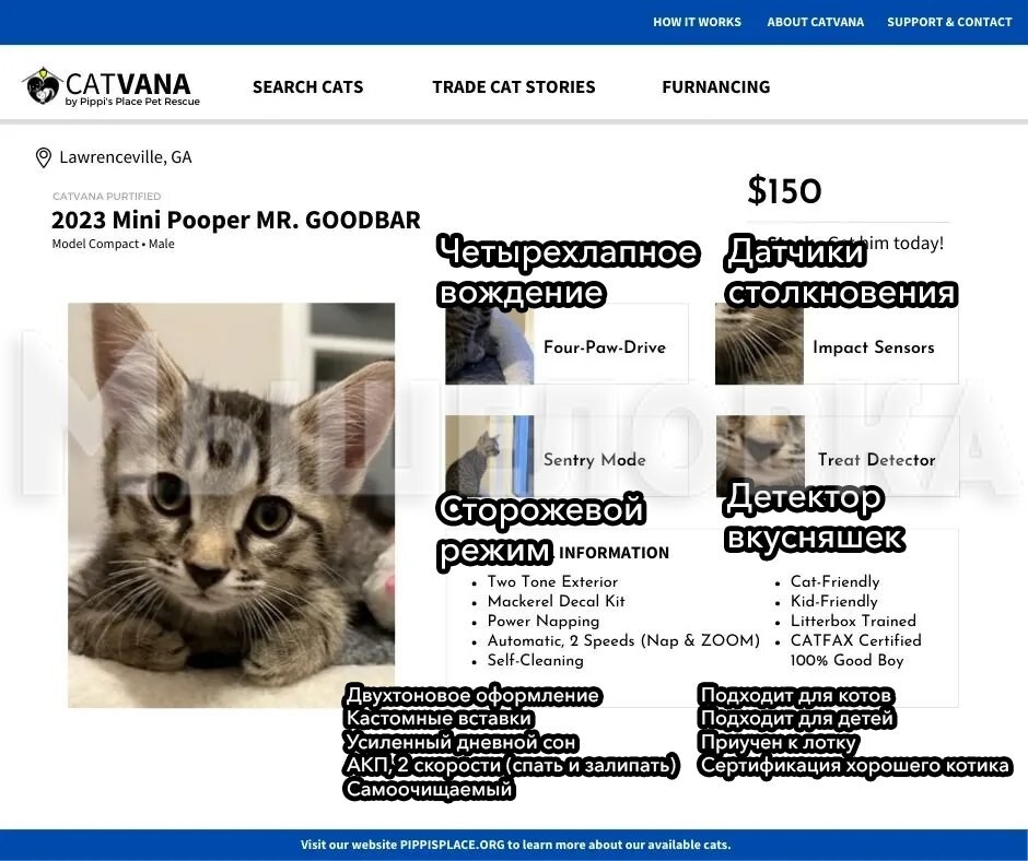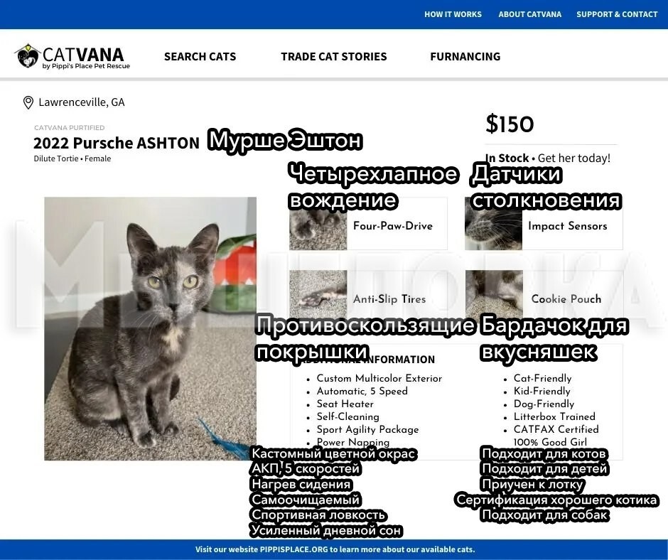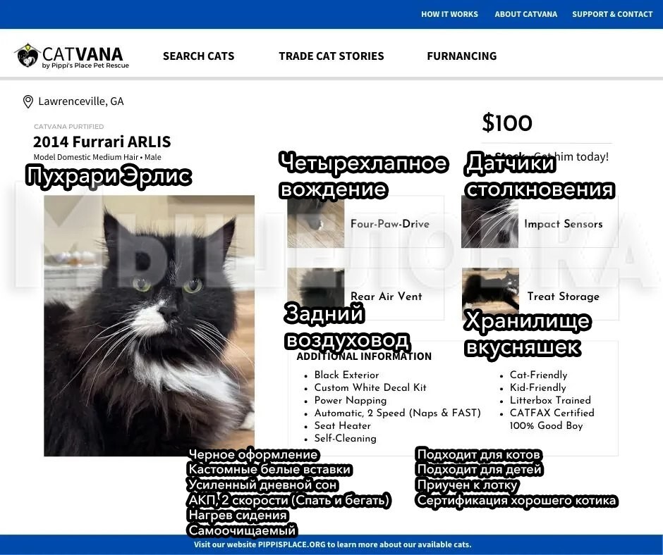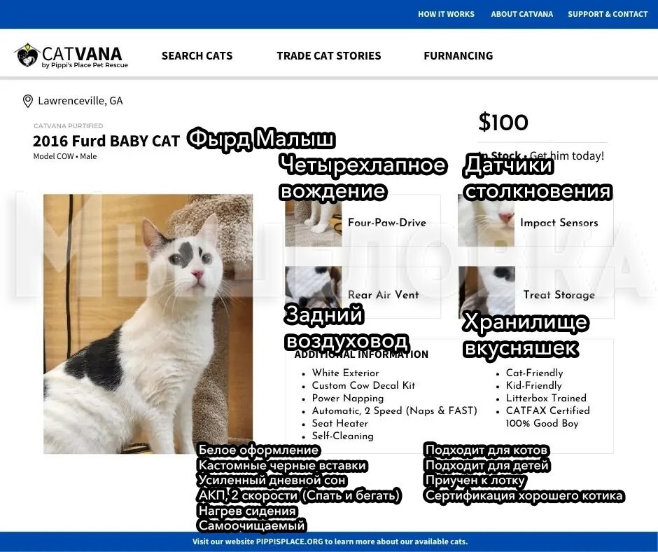 Then the cunning woman made a layout of the site, where she presented her an establishment in the form of a car dealership. And so they appeared "Kotilaki" and "Furrari" with a black and white nose.