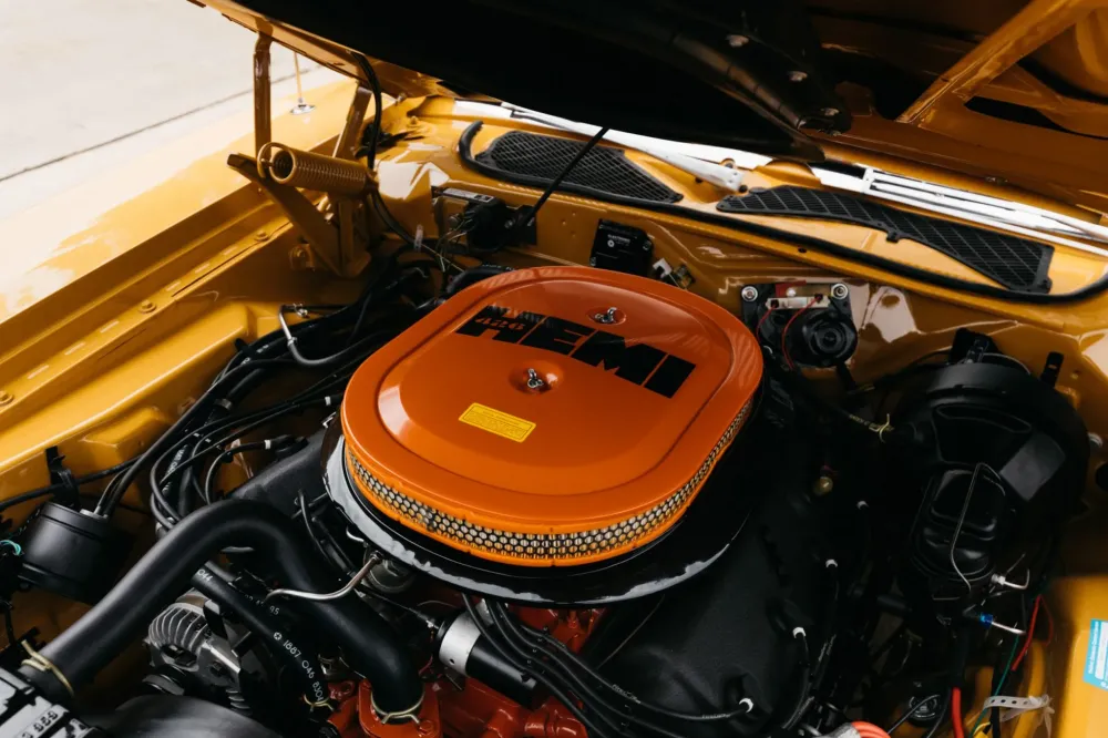 The engine developed about 430 hp. and 665 Nm and allowed a muscle car to drive a quarter mile in about 13 seconds. Additional the attractiveness of this particular instance is added by a four-stage manual Hurst. Such a transmission was equipped with only a part cars, others received a three-band "automatic". After 1971 model year, the 426 cc engine was not used on the Charger.
