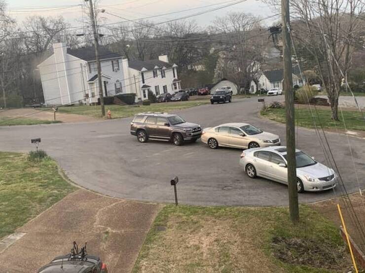 10. "This is how our neighbor parks, blocking our way out of the house"