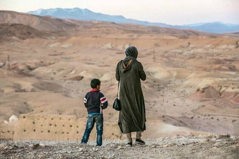 Mom and son enjoy the view of the ancient city of Ait Ben Haddou in Morocco