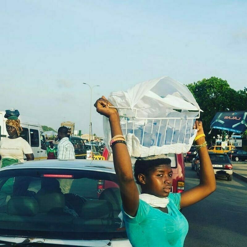 A girl carries water while maneuvering in traffic, Accra, Ghana