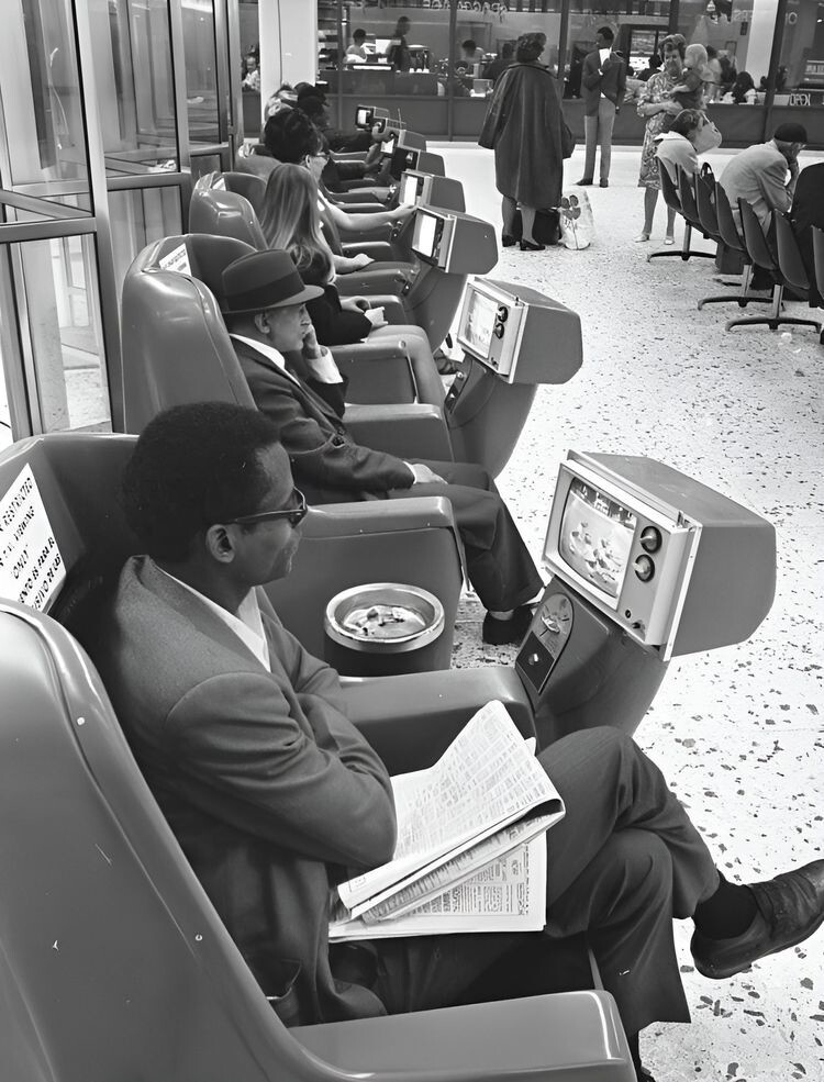 Coin-operated televisions in the waiting room at the Los Angeles bus station, 1969