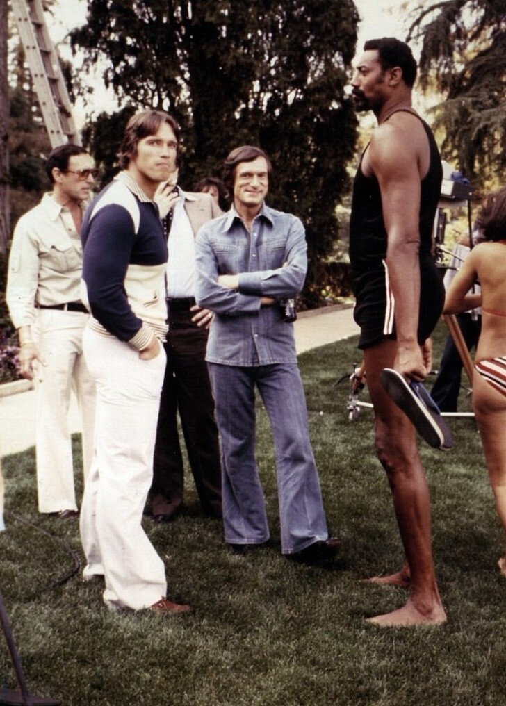 7. Arnold Schwarzenegger, Hugh Hefner and basketball player Wilt Chamberlain. And Arnie is not that big!