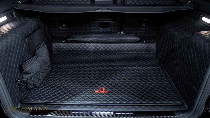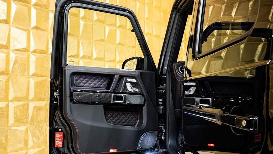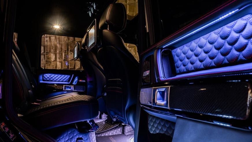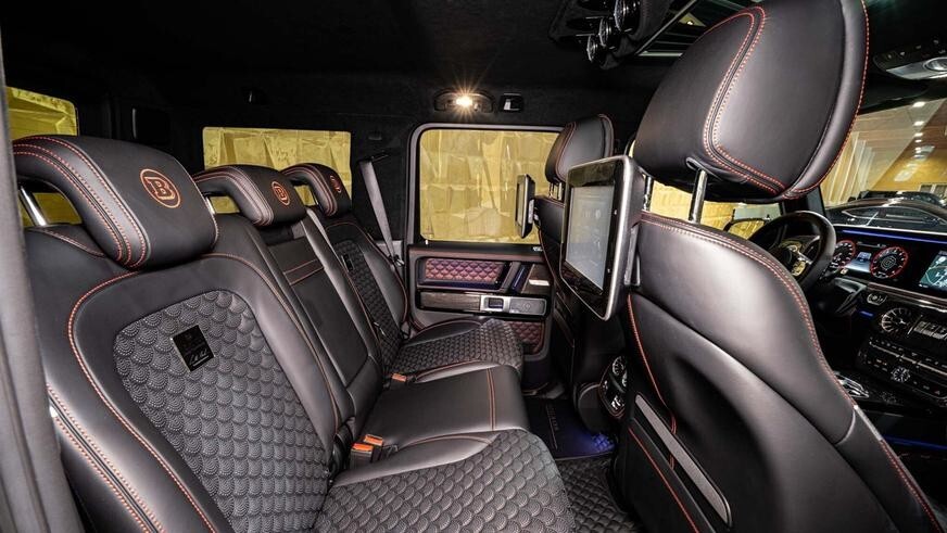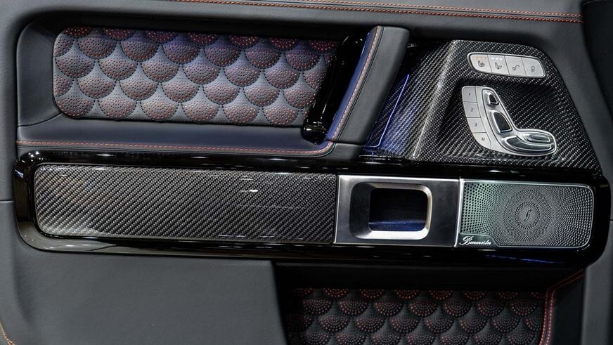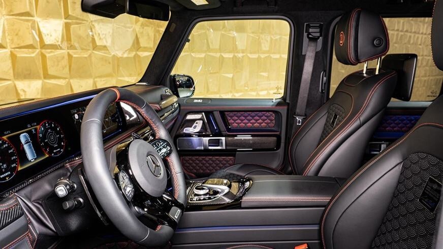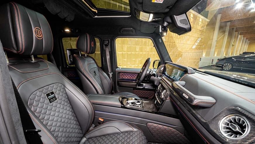 In addition to the powerful engine, the G V12 900 project provides carbon fiber body kit, custom exhaust system and 24-inch wheels disks. The interior of each of the ten SUVs is finished in accordance with the wishes of the customer. This particular instance has it completely re-upholstered in black leather with perforations and red stitching, and decorated carbon pads.