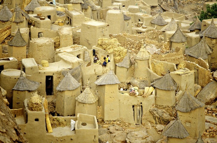 The ideal Dogon village is built on the principle of human body. Clay houses differ in purpose and location. The head is a toguna, a house for men's gatherings. In the chest and abdomen - familial houses with gabled roofs. In place of the genitals - sacrificial altars. The hands are the homes where women go during their periods.