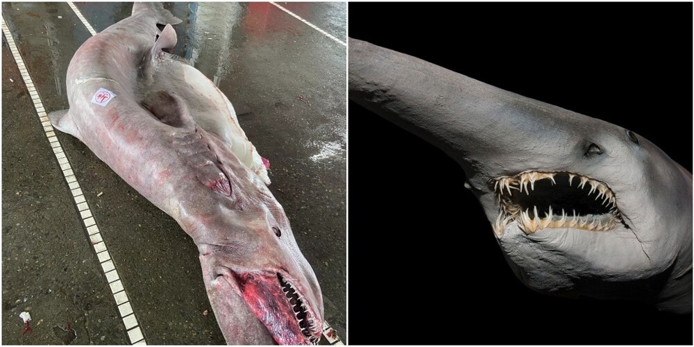 These sharks look intimidating - especially their jaws and outgrowths. on the nose, which helps them find prey even in deep darkness. When the goblin shark catches prey, it extends its jaws, and together with the victim draws water into the mouth. They are pinkish and gray in color, and it often turns brown after death. Color can also be pinkish purple if the shark's blood vessels are damaged fishing gear.