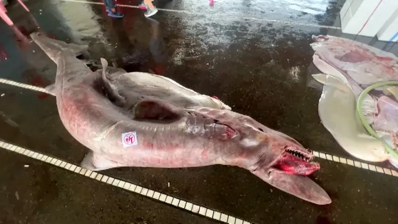 Fishing boat caught off the northeast coast Taiwan's huge 800-pound goblin shark. Rare deep sea the shark was pregnant with six cubs, and its length was 4.7 meters. Initially, the fishermen planned to sell their catch to a restaurant - but The Taiwan Ocean Museum had other plans for her. It turned out, this is the largest goblin shark caught in these waters, so its taken to the museum - and they plan to make an exhibit out of it. shark in the future will be used for educational purposes.