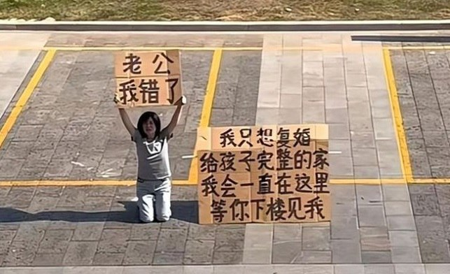 The big sign says, "All I want is again get married and give our child a full-fledged family. I will stand here and wait until you come down to me."