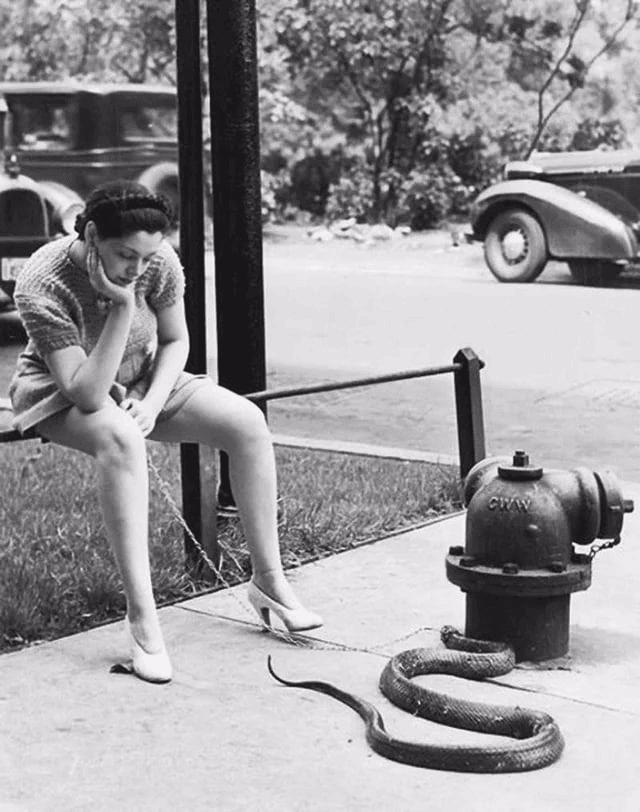 A girl walks a snake on a leash, 1937. Pictured is an American burlex dancer Zorita. She became famous for dancing with boas.