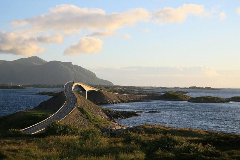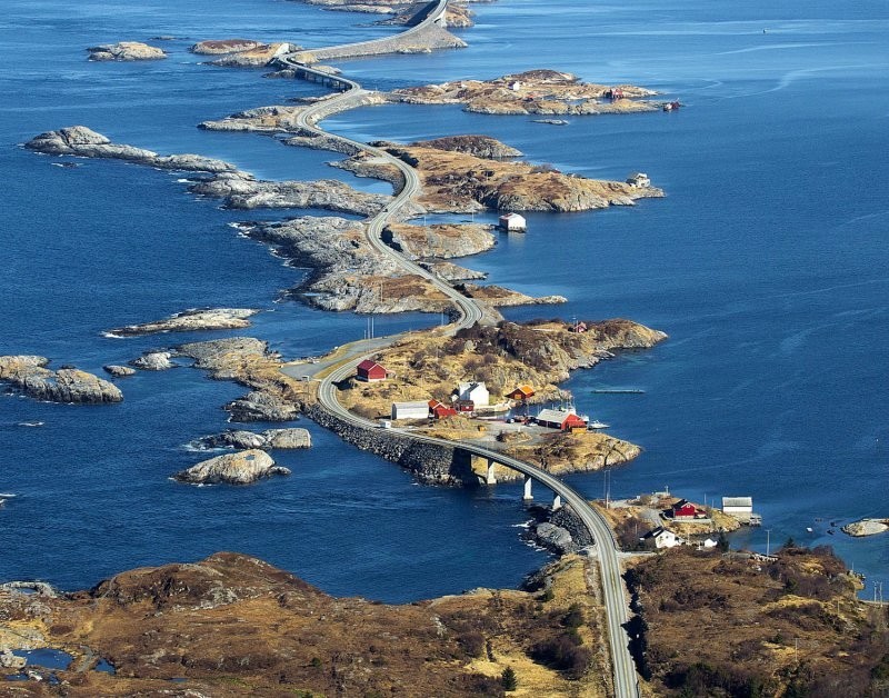 A section of a two-lane highway is located between the populated points of Molde and Kristiansund and links small islands through Atlantic Ocean. In summer, seals and whales can be observed in the waters, and in autumn, the road becomes attractive in its own way thanks to strong showers. The length of the section is only 8.3 km, including 8 bridges. The most ineresting among them - Storsesandetsky, he is also called "drunk". Under from a certain angle of view, it resembles a roller coaster.