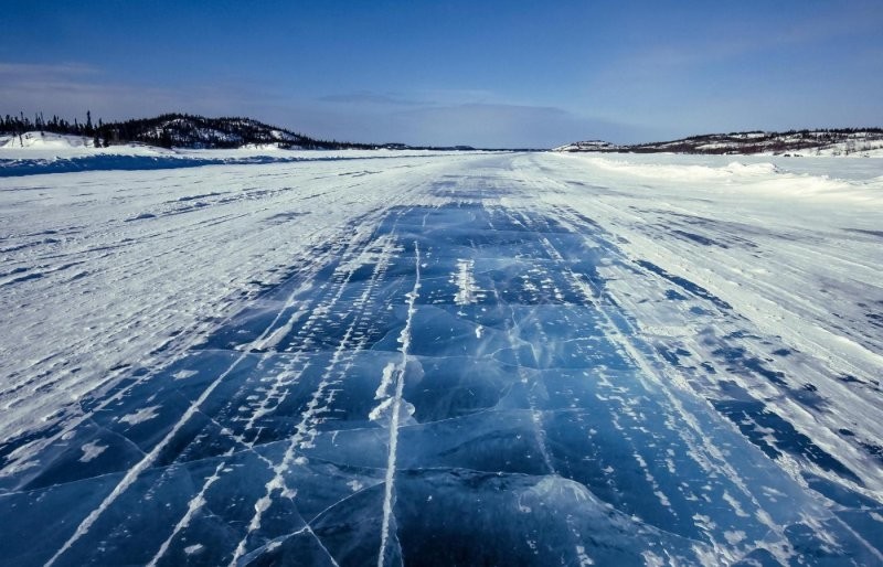 Most (about 85%) of the Tibbitt-Kontvoito winter road passes through frozen lakes. The length of the road is almost 400 km from Lake Tibbitt to Lake Contwoito, and was originally built for the Lupine gold mine. In order to be able to to pass heavy trucks, the thickness of the ice must be at least 74 cm. The road is open only for a few months of the year - from January to March. Speed limits vary from 10 km/h to 60 km/h.