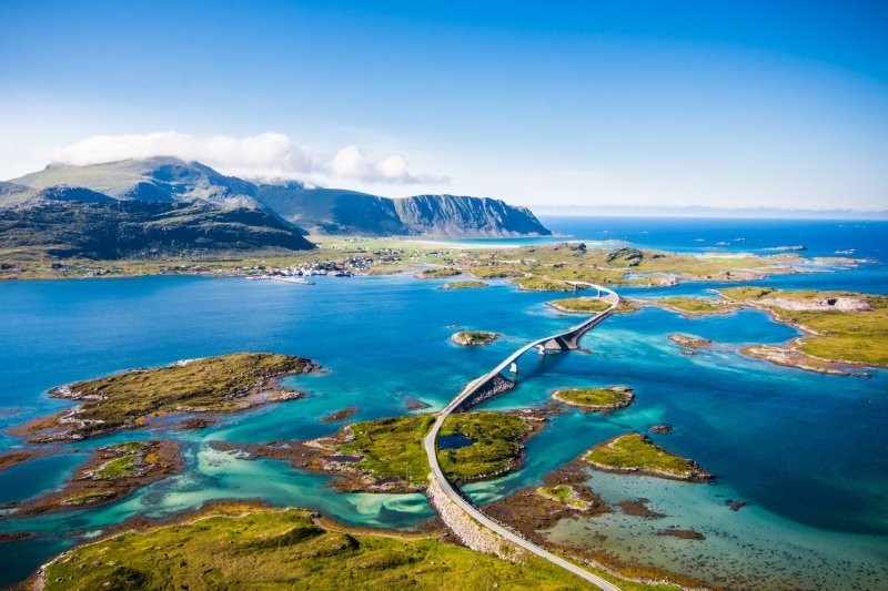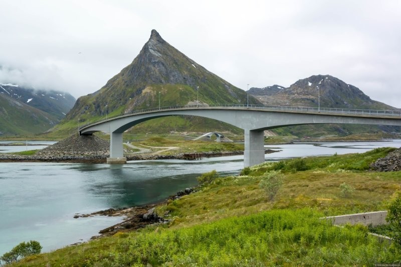 Road Fv808 passes through an archipelago in northern Norway. The highlight of the route, surrounded by breathtaking mountain landscapes, are the two Fredwang bridges. They are 240 meters long and the main span 115 meters and connect four islets.