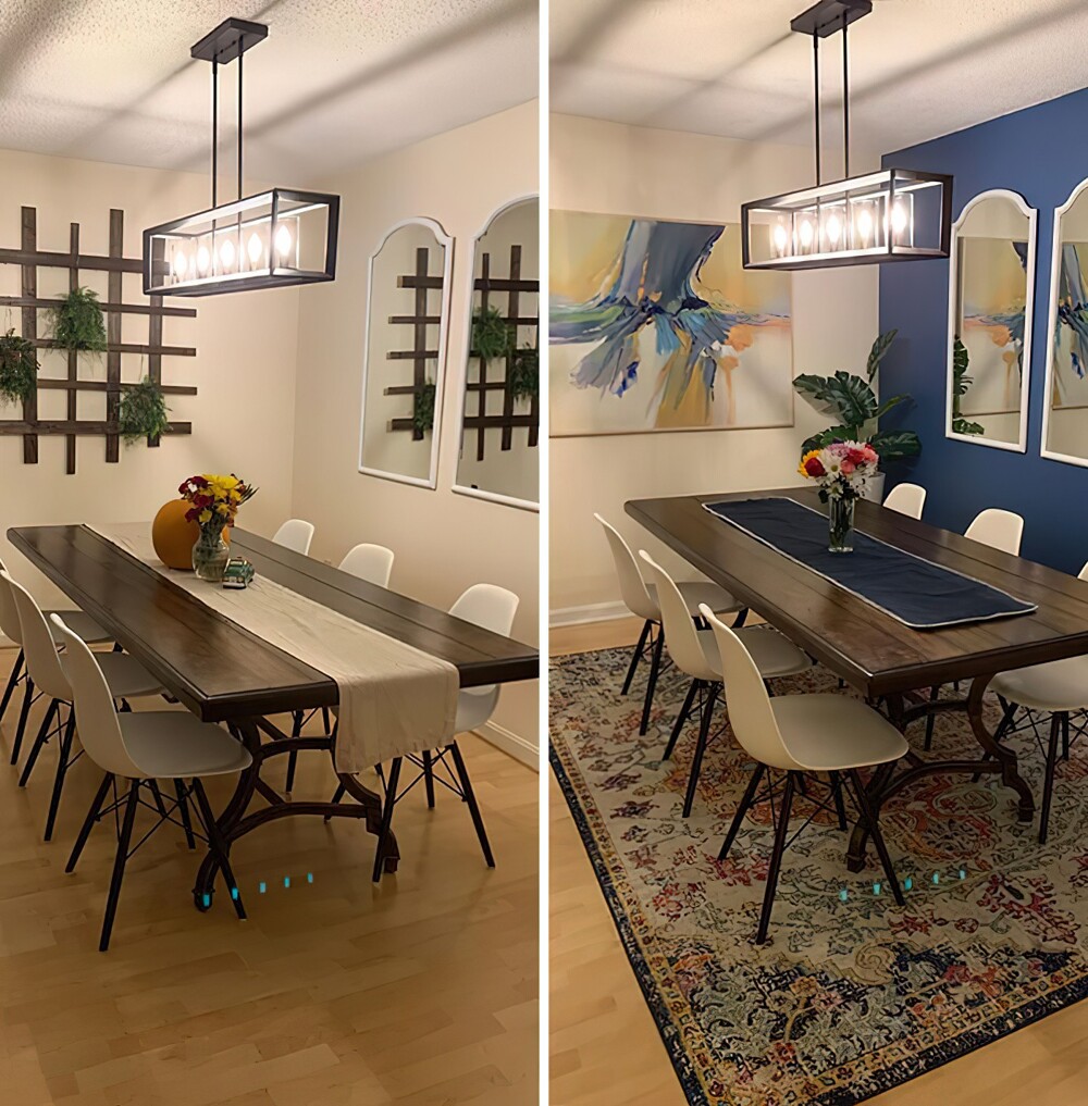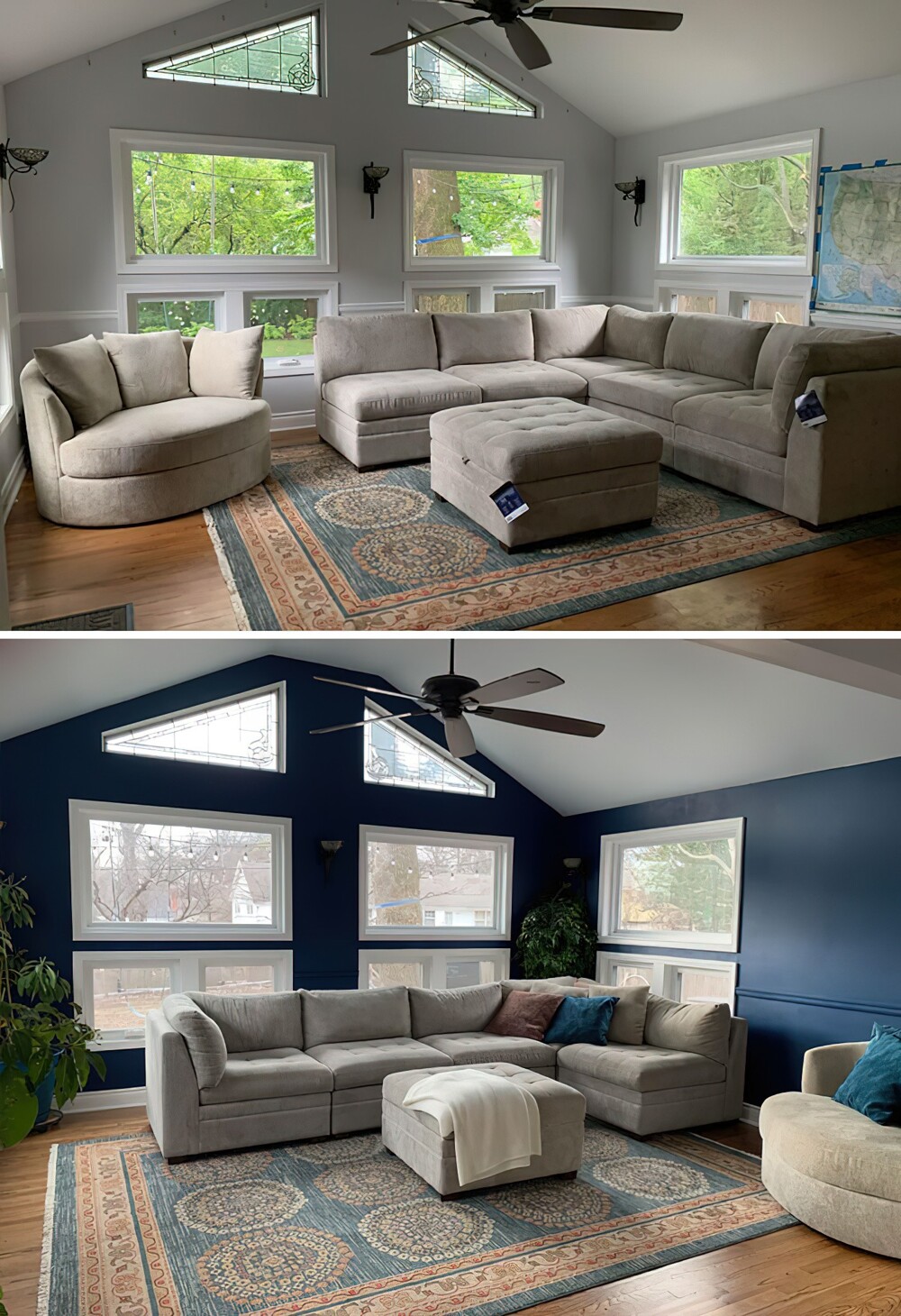 12. “Before and after (blue). Following your advice, we painted walls, pulled out the carpet from under the corner sofa and moved the round sofa to a less visible place