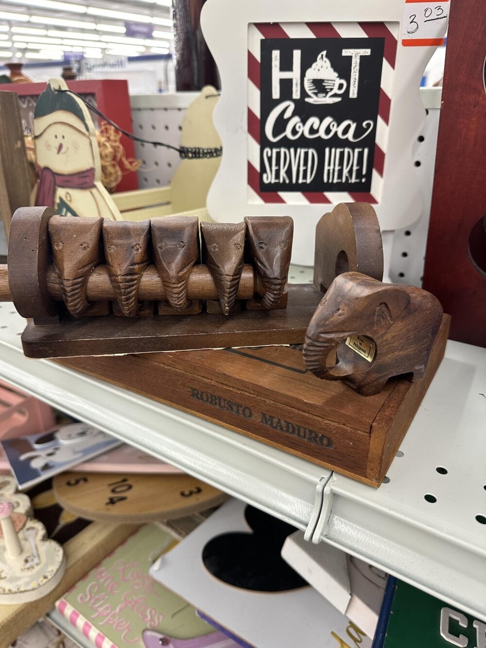6. Wooden elephants with a rod threaded through them. The rod extends and the elephants are removed