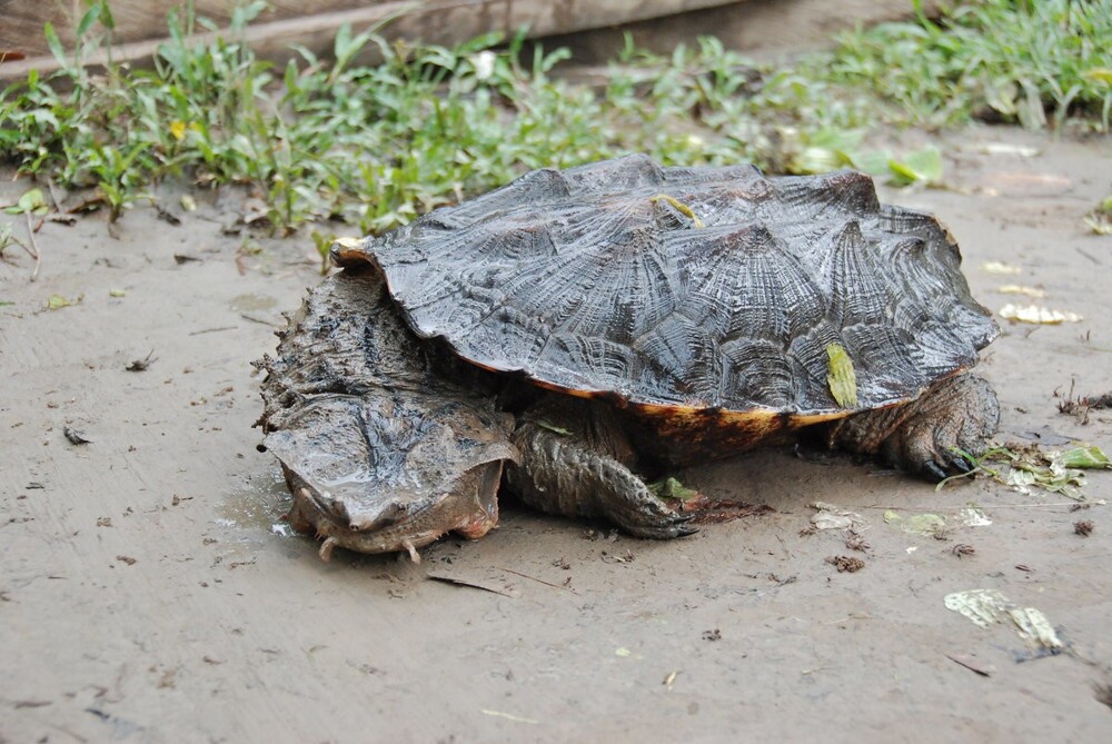 The turtle resembles a prehistoric animal in its cone-shaped tubercles on the shell and a triangular massive head, which is complemented by a funny proboscis.