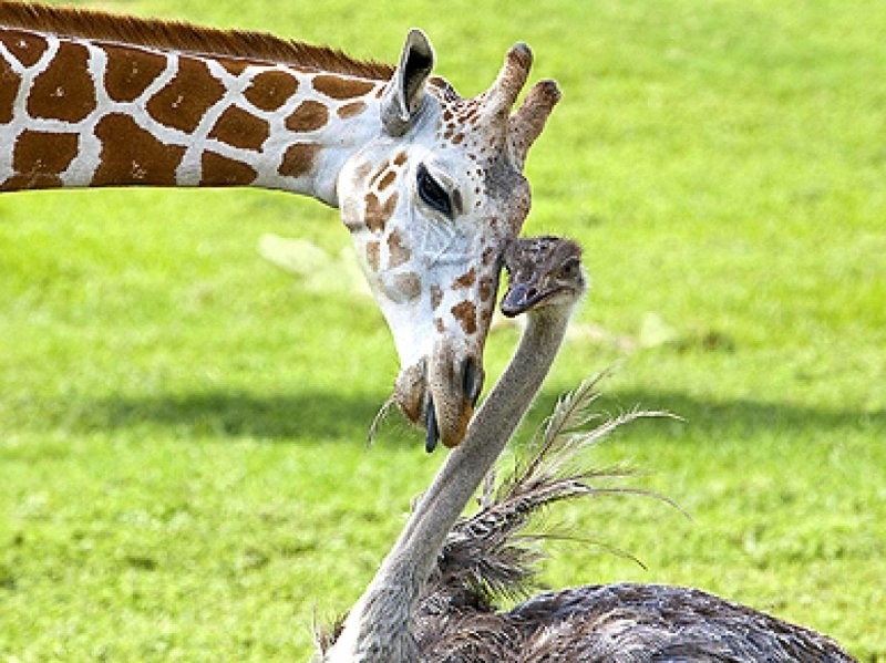 A couple of long necks live in Florida's Busch Garden Zoo located in Tampa Bay. The two of them never get bored of society each other: on a territory of 26 hectares where they live, African elephants, zebras, giraffes, birds and rhinos, Bea and Wilma suddenly became most loyal friends. Usually, the prevailing majority of animals, prefers his own kind.