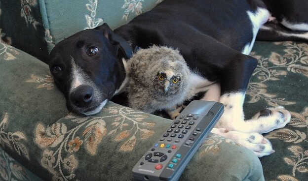 Torquay was only six months old when she started taking care of the chick. long-eared owl, which falconers slept. One of the hunters named John Picton, from the very beginning he slowly introduced the owlet and his dog. At first he just fed them in the same room, then he began gradually bring Shrek closer to Torquay. Now they're inseparable a couple of friends.