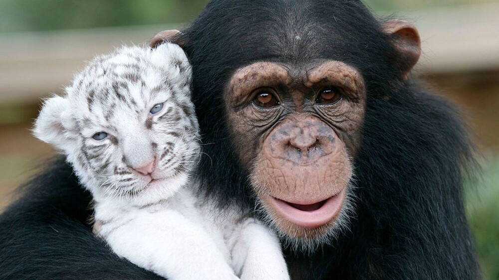 On the territory of the Institute of Rare and Endangered Animals (California) two white tiger cubs were born during a hurricane. Many of the premises were flooded and the animals needed to be urgently evacuate. Baby tigers given to animal educator China York, and her chimpanzee, Anyana, was so eager to help York that quite quickly seized the initiative in their strong paws. Anyana herself as a child, she was a ward of Chyna and now she is her faithful assistant, helping dozens of animals in the shelter.