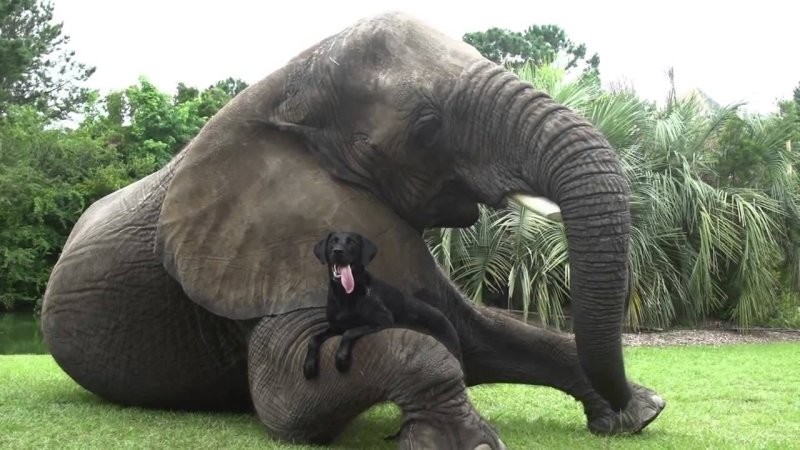 These guys live in a safari park in Myrtle Beach. Bubbles was as a baby when his father and mother were killed by poachers. Elephant rescued and gave him shelter in the park. Bella and Bubbles are very fond of messing around together in water or roll on the grass. It's funny that an elephant throws a ball with its trunk, and Bella catches it by jumping off Bubbles' head.