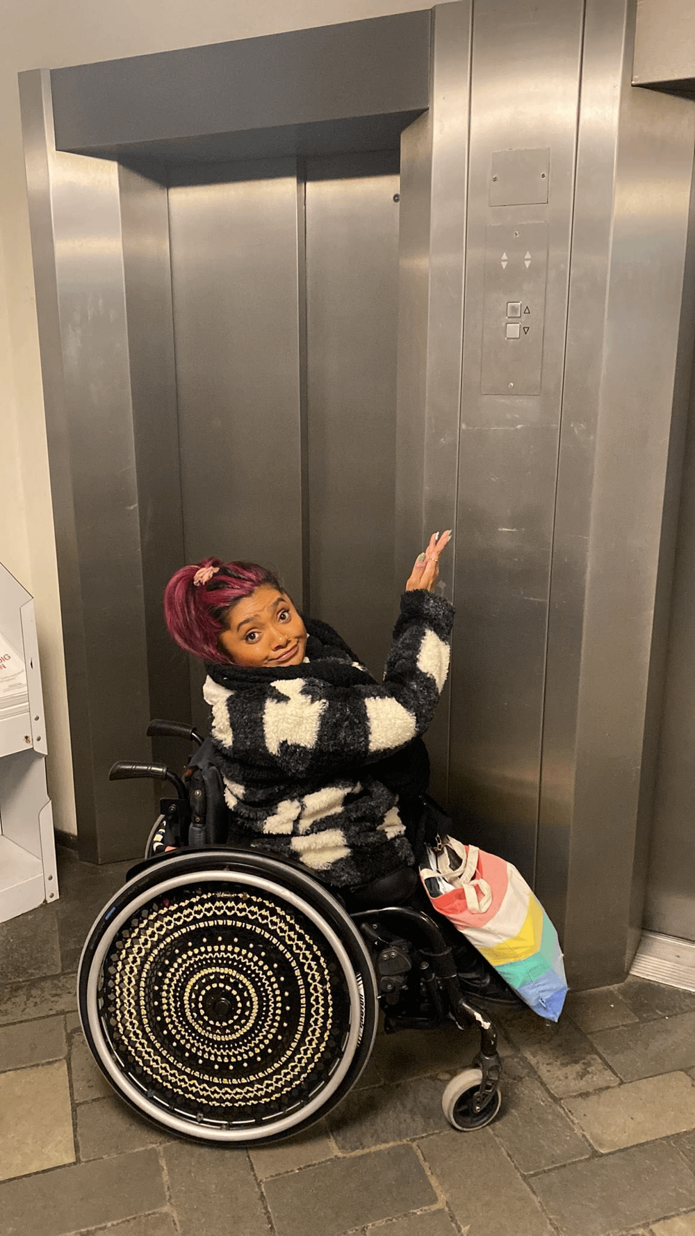 8. To get to the elevator button, you need to get out of the stroller
