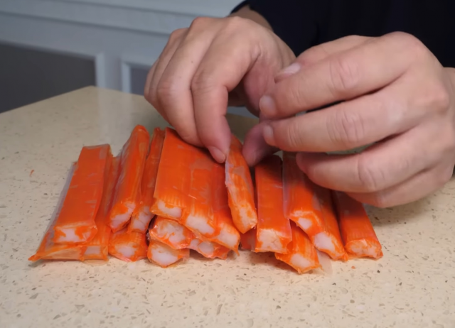 Crab sticks are prepared from a special fish paste minced meat called surimi. It is packaged in large bags and frozen. Already in finished form, future crab sticks are brought to the factory.
