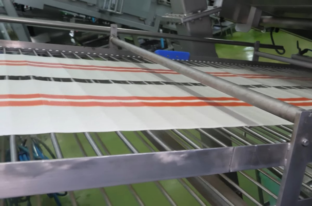 The second stage - the minced meat is unpacked and unloaded onto the tape