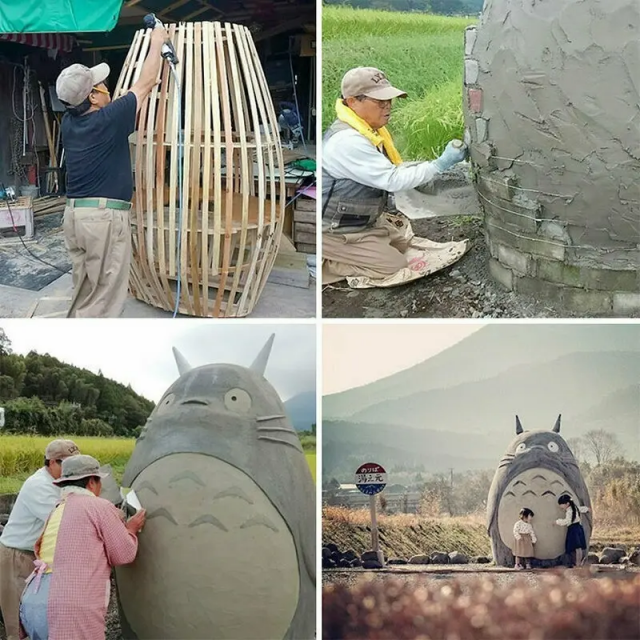 Grandfather and grandmother made Totoro for their granddaughter at the bus stop