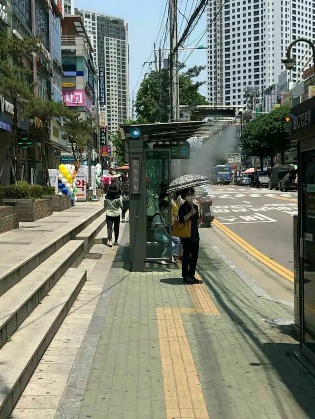 A bus stop in Korea that sprays fog to keep it cool