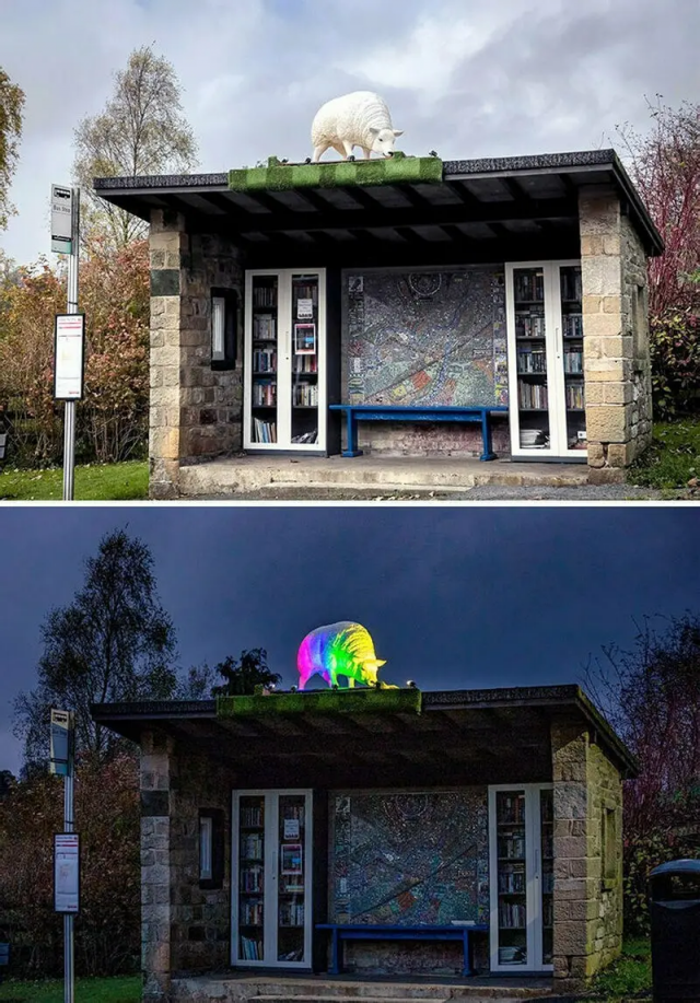Bookcases and a sheep on the roof