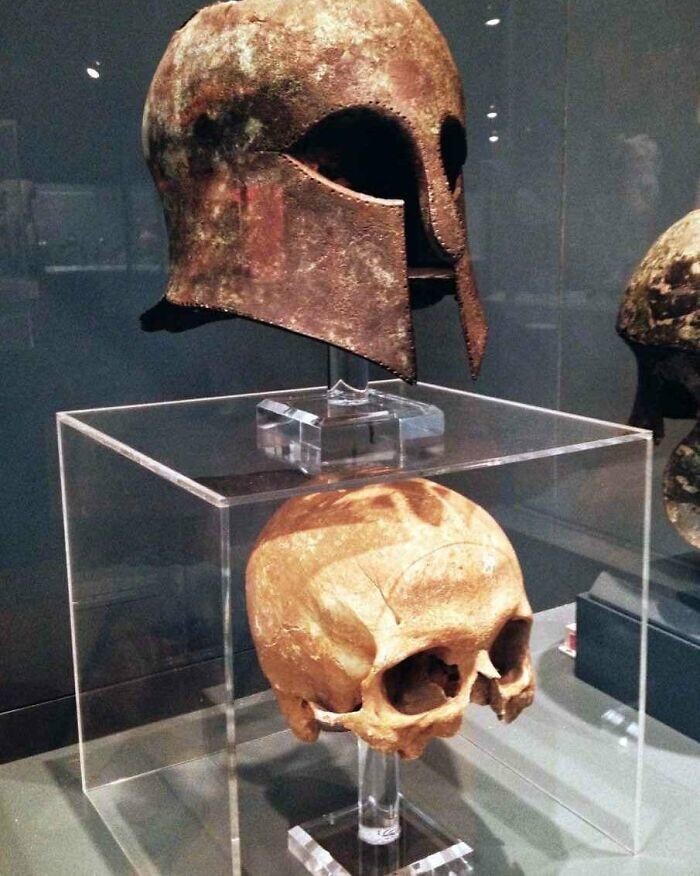43. Corinthian helmet from the time of the battle of Marathon (490 BC) and the skull of a warrior