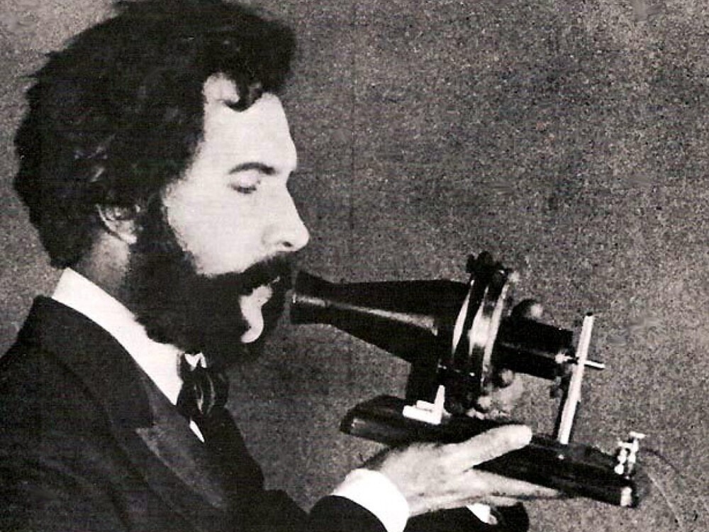 22. Actor portraying Alexander Graham Bell, an inventor telephone, speaks in an early model of the device for a 1926 promotional film American Telephone and Telegraph Company of the Year