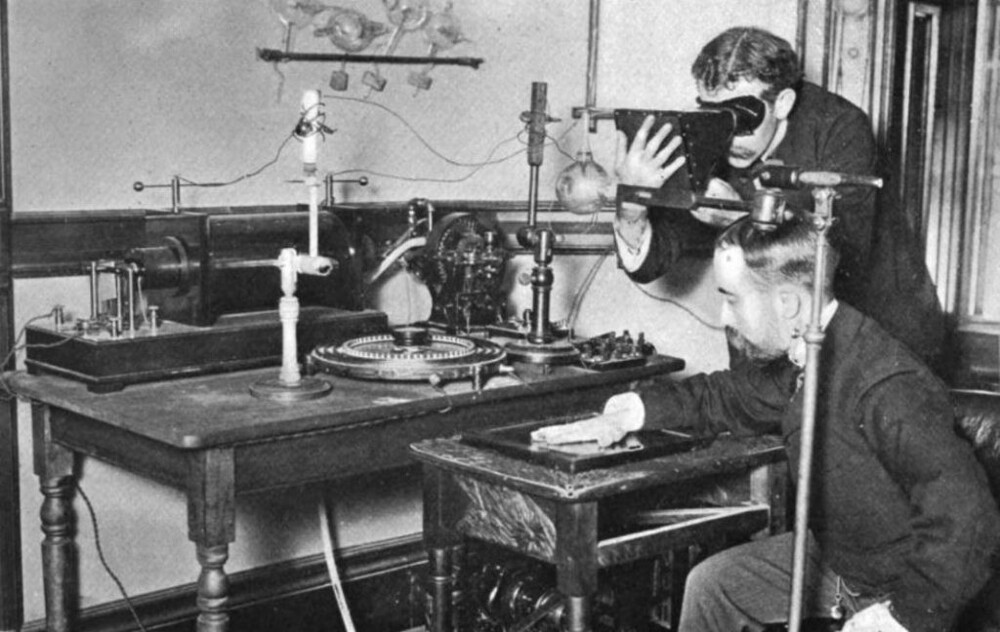 27. Scientists take an x-ray with an early Crookes tube apparatus, late 1800s.