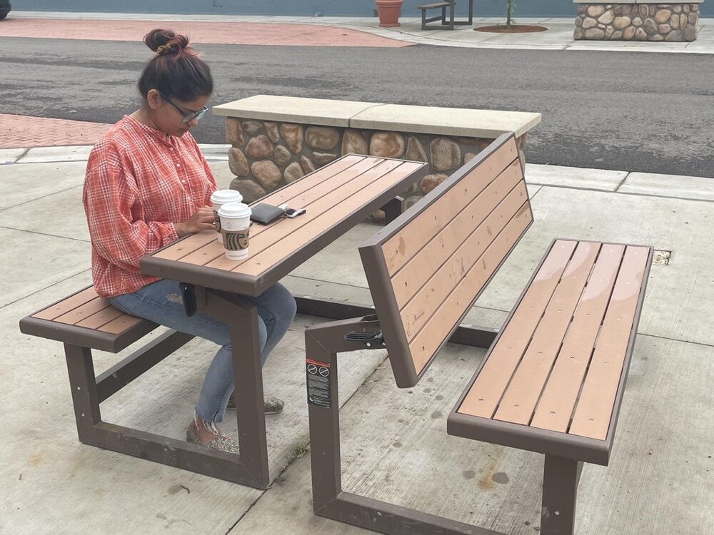 11. A park bench can be folded up and turned into a table.